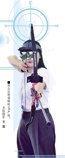 戴上特制的眼镜,拉弓搭箭,瞄准显示屏幕上的靶心射出,自动计算成绩……在MR技术体验区,工作人员一边演示射箭,一边绘声绘色向观众介绍产品性能和优势。“我们这款虚拟现实产品在体育健身领域已经得到应用,目前反馈很好,市民下班后,可以在家里练习射箭,不用专门去射箭场了,非常方便。”工作人员介绍,采用MR技术,可以让用户在小空间内沉浸式体验,不仅能节省空间和时间,还能让用户体验到全新的互动感和愉悦感。
