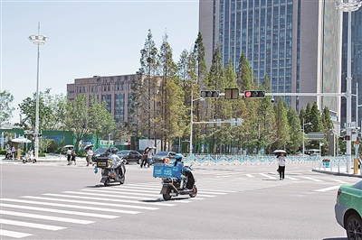 记者看到,一些骑手在直行红灯亮起时,趁着路口车流“空档”加大马力冲过去。另外,机动车道左转红灯亮起时,不少骑手为了节省时间,骑着车与行人一起通行,借助路口的两条人行横道完成左拐。