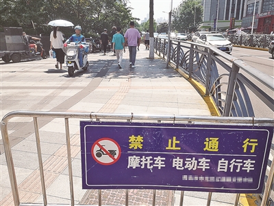 记者在市北区敦化路、徐州路路口看到,虽然徐州路东侧的人行道上立有“摩托车、电动车、自行车禁止通行”的警示牌,但骑手依然在此争道抢行。记者细数,30分钟内有40多辆外卖车辆进入该路段。不少外卖骑手急于送餐,持续鸣笛提示路人躲闪让路。