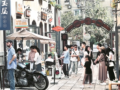 在济宁路的三江里,记者看到,创意照相馆、木工作坊、编织、艺术商店、精酿咖啡、博物馆等,让整条街成为时下热门的Citywalk好去处。“失物招领”照相馆尽管位置有些偏僻,但人气居高不下,店内外的照片墙上挂满了留念照片。