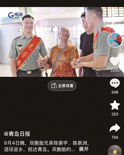 “原中国人民解放军陆军中士陈裴宇、陈泉洲已圆满完成服役任务。长子陈裴宇、次子陈泉洲返乡报到,请指示!”“欢迎回家!” 9月4日,观海新闻报道了青岛双胞胎兄弟陈裴宇、陈泉洲退役返乡的新闻,独家原创视频在抖音、微博等平台迅速传播,粉丝网友纷纷点赞。9月12日,人民网、《中国日报》、中国网等央媒平台及全国地方媒体相继转发观海新闻原创视频,话题迅速登上微博热搜榜,仅用4小时话题阅读量就超过9624万次,截至发稿时,相关话题阅读量累计超过1.88亿次。