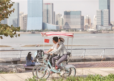 ■在位于西海岸新区的唐岛湾公园,不少市民和游客前来游玩,赶海、散步、骑车,尽情享受着假期的快乐与惬意。韩 星 摄