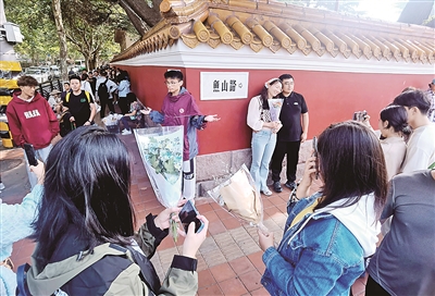 ■“双节”假期以来,青岛老街区热度不减,人流如潮。在大学路网红墙,众多游客驻足打卡留念。 王 雷 摄