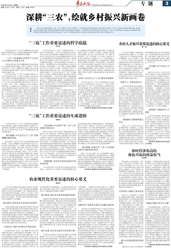 我国是农业大国,解决好“三农”问题一直是全党工作的重中之重。习近平总书记始终心系“三农”,对农业生产、农村发展和农民生活深入调查研究,就做好“三农”工作做出一系列重要指示和重要部署。2019年9月5日,习近平总书记在给全国涉农高校的书记校长和专家代表的回信中指出,涉农高校要“以立德树人为根本,以强农兴农为己任,拿出更多科技成果,培养更多知农爱农新型人才”。强农兴农是党中央赋予涉农高校的战略使命,新时代涉农高校要勇担使命,争做强农兴农的排头兵。