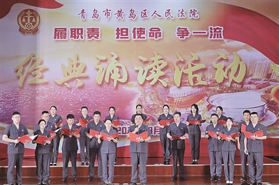 ■为庆祝中华人民共和国成立74周年,进一步弘扬法院干警奋发进取、砥砺前行、争创一流的精神风貌,全力锻造一支能够担当时代重任的高素质法院队伍,黄岛法院日前举办“履职责 担使命 争一流”经典诵读活动。