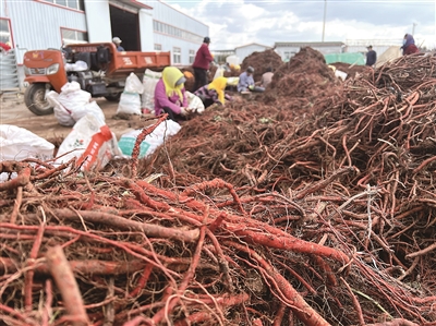 眼下正值丹参丰收季节。即墨区灵山街道的中药种植基地里,大型机械来回穿梭,200多名工人忙着分装丹参。“今年雨水适宜,一颗就有两斤多,每亩地能多产1000斤,亩产达到3000—4000斤。”基地负责人王涛说,这些丹参在收获前已被厂家早早预订。
