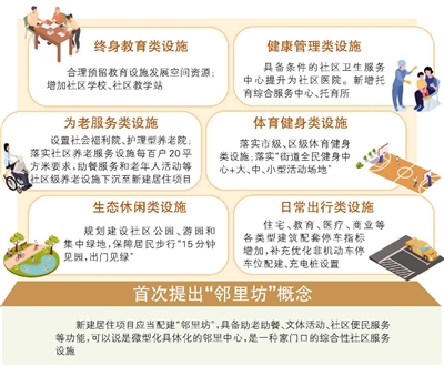 新建居住项目应当配建“邻里坊”,具备助老助餐、文体活动、社区便民服务等功能,可以说是微型化具体化的邻里中心,是一种家门口的综合性社区服务设施