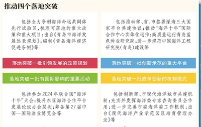 包括全力争创海洋命运共同体先行试验区,梳理可落地的重大政策和重大项目;出台《青岛市海洋发展远景规划》;编制《青岛海洋经济促进条例》等