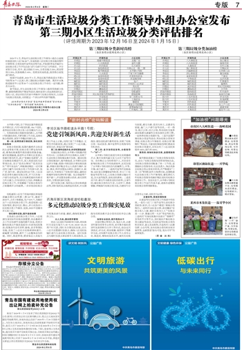 根据评估成绩,2024年1月,李沧区振华路街道永平路1号院等20个小区进入第三期垃圾分类新时尚榜。莱西市水集街道温哥华小区等20个小区垃圾分类工作存在一定问题,排名后20位。