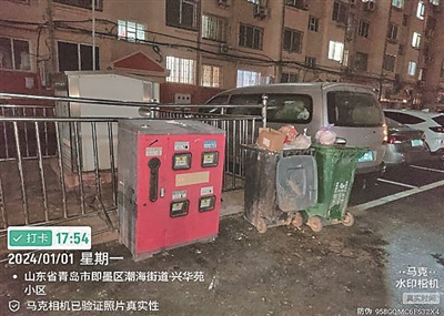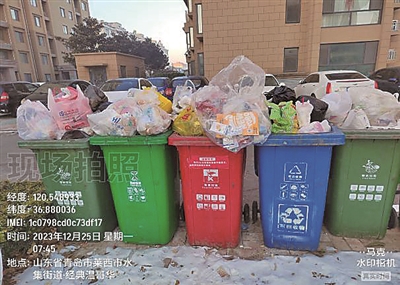莱西市水集街道——温哥华小区 ■宣传栏等“三栏”缺失;垃圾冒溢严重,可回收物、有害垃圾、厨余垃圾桶混投其他垃圾。