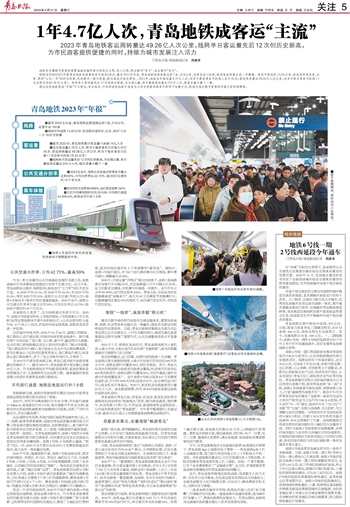 ~~~2023年青岛地铁客运周转量达49.26亿人次公里,线网单日客运量先后12次创历史新高,为市民游客提供便捷的同时,持续为城市发展注入活力