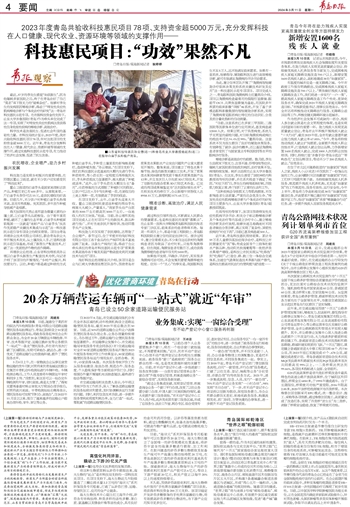 科学技术是改善民生、促进社会和谐的基础性力量。市科技局统计显示,2023年度,我市共验收科技惠民项目78项,针对这批项目的支持资金超5000万元。近年来,青岛充分发挥科技在人口健康、现代农业、资源环境等领域的支撑作用,通过实施科技惠民示范专项,有力推动了经济社会发展、促进了民生改善。