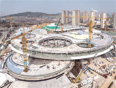 近日,记者走入该项目建设现场,随处可见争分夺秒、热火朝天的施工场景:600余名建设者在各自岗位上忙碌着,有的在火花四溅之间焊接龙骨,有的在高空中安装UHPC幕墙和玻璃幕墙,还有的全副武装开展屋面防水作业,与此同时,各类机械设备往来穿梭。