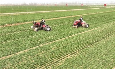 ■即墨区蓝村街道壮武村的青岛市级绿色增粮先行示范区内,农机手驾驶镇压机作业。 邢志峰 摄