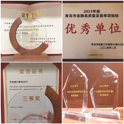 近年来,平安银行青岛分行荣获青岛市金融工作领导小组授予的“青岛市2022年度金融创新三等奖”、2023年度金融高质量发展单项指标优秀单位,荣获中国人民银行青岛市分行及监管部门授予的“金融服务制造业优胜单位”“小微企业金融服务先进单位”荣誉称号;“‘微e贷’支农惠企 助力乡村振兴”“金融+科技赋能新型供应链金融”两个案例分别入选年度青岛企业经济成就高质量发展典型案例和数字经济发展典型案例。在青岛市2022年银行机构服务实体经济考评中获得“一档”优秀银行机构,获得青岛市金融工作领导小组感谢信表彰。