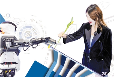 ■在海尔智家展区,观众与国内首款面向家庭场景服务的人形机器人“夸父”互动。