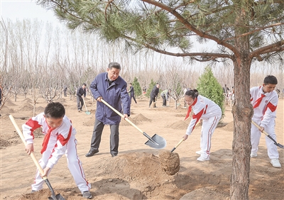 挥锹铲土、培土围堰、提水浇灌……习近平接连种下油松、黄栌、元宝枫、樱桃、红叶碧桃、侧柏等多棵树苗。习近平一边植树,一边询问孩子们的学习生活、劳动锻炼情况。他强调,广大青少年是祖国的未来,从小要积极参加劳动、植树造林,把绿色的种子种进心里,养成尊重自然、热爱自然的意识,勤奋学习、锻炼身体、茁壮成长,德智体美劳全面发展,努力成为国家栋梁。植树现场一派热火朝天的劳动景象,领导同志们同大家一起培土浇水,气氛热烈。