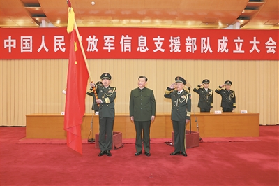 新华社北京4月19日电(记者梅常伟)中国人民解放军信息支援部队成立大会19日在北京八一大楼隆重举行。中共中央总书记、国家主席、中央军委主席习近平向信息支援部队授予军旗并致训词,代表党中央和中央军委向信息支援部队全体官兵致以热烈祝贺。他强调,要贯彻新时代强军思想,贯彻新时代军事战略方针,坚持政治建军、改革强军、科技强军、人才强军、依法治军,聚焦备战打仗,按照体系融合、全域支撑的战略要求,锐意进取,扎实工作,努力建设一支强大的现代化信息支援部队。