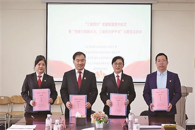 ■日前,山东高院刑二庭党支部、青岛中院刑一庭党支部、黄岛区法院机关第六党支部、青岛理工大学人文与外国语学院社会工作专业教研室党支部结为党建联建单位,并以“党建引领聚合力,三级四方护平安”为主题,共同签署三级四方党建联建协议书。通过党建联建,提高政治站位,筑牢织密“纵向贯通、高效协调、执行有力”的党建组织体系,把整合“党建+业务”执行力贯彻落实到国家安全工作的各领域全过程。
