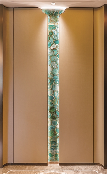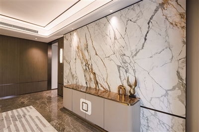 走进海尚府二期约190平方米精装样板间,“意式东方”风格的设计气息便扑面而来。4室2厅3卫四南向的空间设计,南向采光面宽达到16.2米,层高3.2米,空间感十足。入户后的玄关背景墙,是整个“意式东方”风格完美呈现的第一个小爆点。由珍贵稀缺的天然宝石“绿玛瑙”打造的海尚府玄关背景墙,与入户玄关地面处用水刀拼花工艺雕刻的“四合如意纹”和手工金箔吊顶相得益彰,精工细作处处强调极致匠造,给予业主极大的归家仪式感。