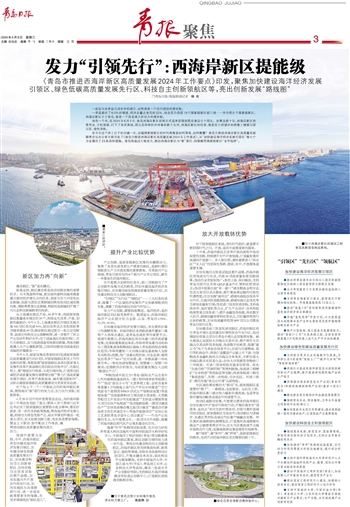 ~~~《青岛市推进西海岸新区高质量发展2024年工作要点》印发,聚焦加快建设海洋经济发展引领区、绿色低碳高质量发展先行区、科技自主创新领航区等,亮出创新发展“路线图”