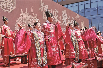 良辰吉时就此刻,新婚燕尔比翼飞。上午10时18分,伴随温馨悠扬的音乐声与传统舞狮表演,30对新人身着传统婚礼服饰登上婚礼舞台。在全场亲朋好友的祝福声中,新郎新娘重现了中式传统婚礼对席、沃盥、合卺、结发、签婚书、执手等仪式。