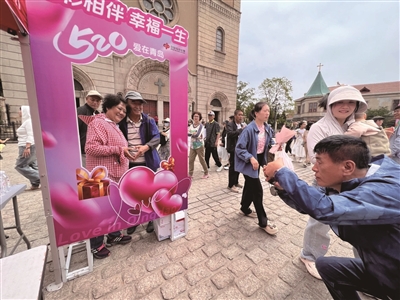 5月19日,青岛天主教堂海誓山盟广场打扮一新,青岛市福利彩票发行中心联合媒体、企业开展的“爱在青岛——大声说出你的爱”婚俗文化展演在此举办。千行百业的青年男女一起唱响爱的浪漫、见证爱的力量。专业摄影师为参与活动的青年人,在青岛福彩专属浪漫打卡墙留下了“520定制版”爱情回忆。