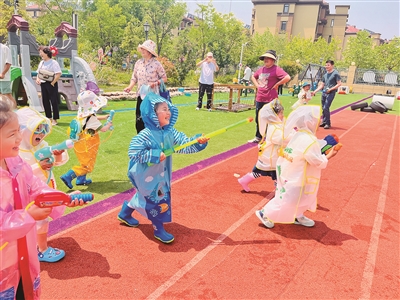 ■李沧区衡水路幼儿园的萌娃们在水游戏中欢度“六一”。 赵 黎 摄
