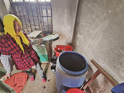 记者在几户村民家看到,屋里都摆放着多个盛水的大桶。在一户村民家中,一个工业用的法兰桶(该桶为工业容器,用来存放化学品或溶剂)里盛着水,水面上漂浮着许多杂质。村民说,这桶里是平时攒下的水,放置时间久了,不能喝,但可以用来洗漱。