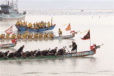 ■6月7日,福建省连江县筱埕镇定海村的村民在海上进行龙舟比赛(无人机照片)。