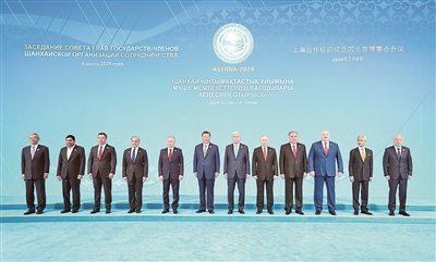当地时间7月4日上午,国家主席习近平在阿斯塔纳独立宫出席上海合作组织成员国元首理事会第二十四次会议。这是习近平同上海合作组织成员国领导人集体合影。     新华社照片