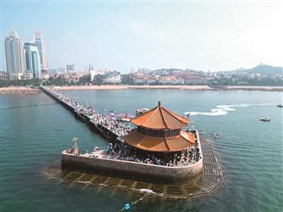 ▲作为青岛城市的标志性景点,栈桥吸引了大批游人前来游玩体验,栈桥上人们来来往往,好不热闹。