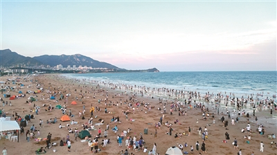 ▲气温升高,许多市民和游客来到海滨景区游玩。傍晚的石老人海水浴场人气十足。 王 雷 摄
