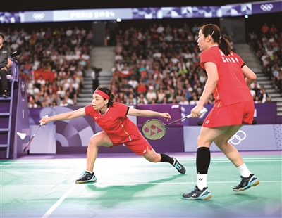 ■8月3日,在巴黎奥运会羽毛球项目女双决赛中,两对中国组合展开较量。最终,陈清晨(左)/贾一凡获得金牌,刘圣书/谭宁获得银牌。 新华社照片