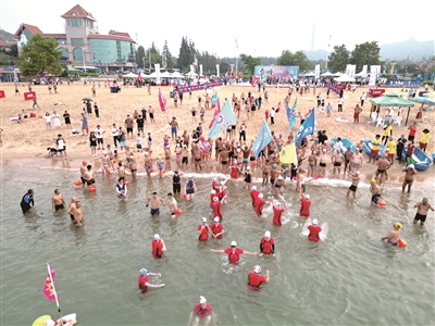 上午8时许,伴随着鸣笛声响,近千名游泳爱好者如离弦之箭涌入海中,劈波斩浪,竞逐汇泉湾。精彩的花式颠球、啦啦操、霹雳舞等项目展演彰显了青岛全民健身的活力。