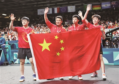当日,在巴黎奥运会乒乓球男团金牌赛中,中国队战胜瑞典队,获得冠军。