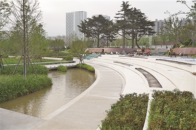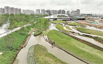 河水潺潺、草木葱茏,焕新中的张村河,仿似一条蜿蜒流淌的碧绿绸带,仅是露出一角,却已展现千种风情——清晨时分,阳光与微风交织在一处,如亲密舞伴,在河面上泛起阵阵涟漪,只见她轻轻环绕,便将城市的繁华与自然的静谧巧妙融合。
