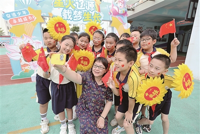 青岛辽源路小学举行爱国主义主题开学典礼,老师与孩子们合影留念。