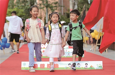 ■青岛桦川路小学一年级新生手拉手迈入学校。