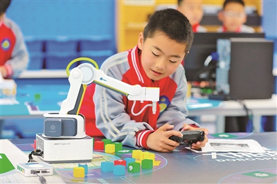 实践和应用是人工智能教育的关键。在开展普及式教学的过程中,不少学生表现出对人工智能更加强烈的兴趣和自主探究意愿,各个学校也搭建了多种多样的个性化学习平台,开展难度能级更高的人工智能课程。西海岸新区双语小学是青岛市唯一获评教育部中小学人工智能教育基地的学校。为了满足学生更高层次人工智能学习要求,学校搭建了五大人工智能场景,涉及stem教育、无人机编程、开源硬件等内容。在学校,学生可以充分发挥创造力,用人工智能解决生活中的问题。“学生针对山林火灾隐患,设计了智慧消防系统;滨海大道早晚高峰车辆多,易拥堵,学生针对这个问题设计了一套智慧交通避堵系统。学生们在思考、解决实际问题的过程中,培养了高阶思维能力、创新能力,也培养了社会责任感。”西海岸新区双语小学智慧教育负责人王立新介绍。