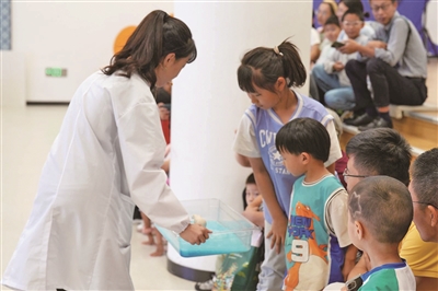 金秋送爽、海风轻拂,青岛科技馆内让人惊喜连连的科学活动在不间断上演。在“深蓝实验工坊”,家长和孩子亲手调制出属于他们的“荧光海”,探索海洋生命的奥秘,感受自然界的神奇与美妙;面对浑浊污水,孩子们化身为“环保小卫士”,让污水在过滤实验中“重获新生”,变废为宝,同时在心中种下环保的种子;在冰川融化实验中,孩子们见证了冰川消融的过程,现场感受环境的变化,激发对环境保护的责任感与使命感;在备受瞩目的青岛科技馆年度特展——“虫林秘境”大型热带雨林实景展览中,探秘动植物王国的科学密码。