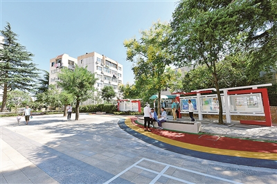 走进延安路街道怡馨苑小区,新铺就的沥青路面干净整洁,粉刷一新的明黄色墙壁掩映在翠绿色的树丛中,每走几步就能看到休闲座椅。在小区户外红色议事角,居民和社区工作人员正在商讨着通过彩绘墙壁美化小区事宜。