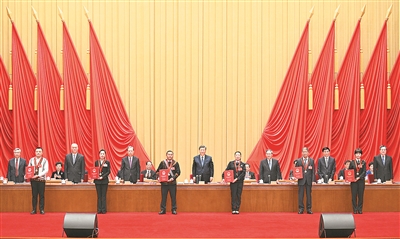 在欢快的乐曲声中,习近平等为受表彰的模范个人和模范集体代表颁奖。