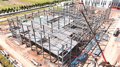 项目现场,一期现代化的厂房已经建成。旁边,二期工地热火朝天,工人们在紧张有序搭建钢结构。戴上安全头盔,戴好手套,搬钢筋、摆底筋、绑扎……王勇是一名资深钢筋工,干这行已经30多年。只见他将扎丝围上钢筋,扎钩灵巧一转,扎丝就稳稳地绑在了钢筋上。“我们在加班加点工作,工地天天都有大量工人,争取早日完工。”7日上午,王勇告诉记者,能为重点项目做点贡献,心里挺自豪。国庆假期,每天都有上百名工人奋战在项目一线,推动项目早日完工。