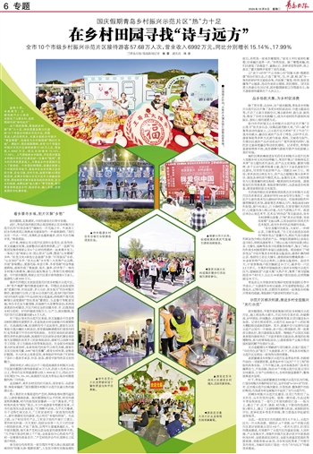 这个国庆假期,青岛的乡村游“热”力十足,特别是青岛聚力打造的10个市级乡村振兴示范片区,凭借其迷人的自然风光、充满乡韵的乡村振兴“青岛图景”,迅速成为乡村旅游的“网红打卡地”。据统计,国庆假期期间,全市10个市级乡村振兴示范片区接待游客57.68万人次,营业收入6992万元,同比分别增长15.14%、17.99%。人气很旺的乡村旅游,不仅是对青岛乡村振兴示范片区建设的一次集中“检阅”,更为村民带来更多收入,为青岛乡村全面振兴注入了新动能。今年国庆假期前,适逢庆祝第七个中国农民丰收节,青岛市农业农村局立足农民主体、农业主线、农村主场,统筹开展43项庆祝活动,发挥乡村振兴示范片区农文旅融合的优势,因地制宜开展丰富多彩的庆祝活动,发力乡村旅游、消费拉动“金九银十”季节优势,吸引更多游客走进乡村、贴近农业、融入农民,在欢度国庆中礼赞丰收。