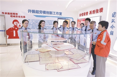 ■近日,许振超被授予“人民工匠”国家荣誉称号。日前,市北区税务局的青年干部走进山东港口青岛港“许振超大师工作室”,学习许振超同志先进事迹,开展税港青年座谈交流,感受“振超精神”和“振超效率”背后所蕴含的“干就干一流,争就争第一”的精神。 万云军 摄
