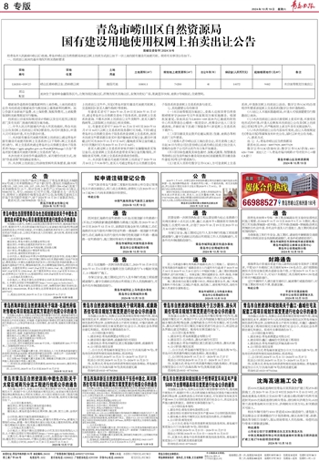 | 青岛市崂山区自然资源局国有建设用地使用权网上拍卖出让公告 | |