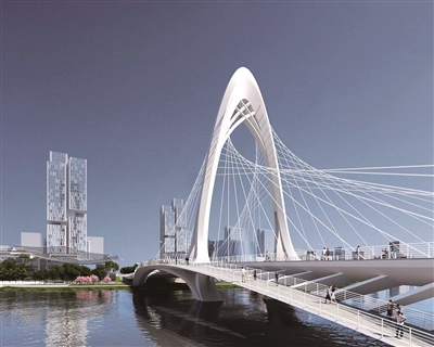 作为张村河河道上五座跨河桥中跨度最大、宽度最宽、施工难度最高的桥梁,科苑经七路桥全长约260米,主塔高65米,桥宽42米至52米,双向八车道,南北向连接长沙路与合肥路,位于创智大道与科创大道之间,周边规划有中心商业区、人才秀台、游客中心、人才党建中心等张村河片区内的众多标志性建筑,并紧邻多个轨道交通站点,是片区核心段重要的交通枢纽。