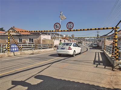 在段家埠桥,桥两端分别安装了2.2米高的限高杆,禁止公交车等大型车辆通过,但小型车辆可正常通行。桥上还有“桥梁危险 注意慢行”的提示牌。记者查看桥体发现,西端桥头侧面的石块存在松动迹象。其中一块长约40厘米的方形石块已经移位,大半部分探出桥体之外,被一根燃气管道挡住,才没有脱落。