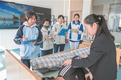 近日,在青岛市技师学院的健康和社会照护实训室内,康养与护理学院教师王丹为学生们讲解帮助老人翻身的技巧。前不久,该学院16岁的学生宋佳在2024年山东省健康照护行业职业技能竞赛决赛“健康照护师”项目中,取得了第五名的佳绩。